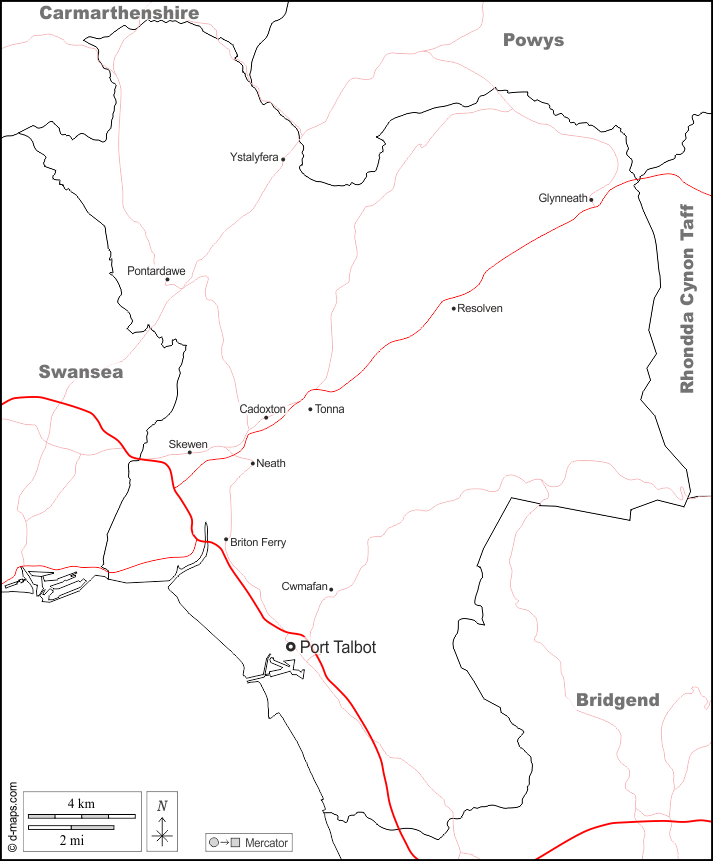 d-maps > यूरोप > युनाइटेड किंगडम > नेथ पोर्ट टैलबोट > सीमाओं, मुख्य शहरों, सड़कों, नाम, सफेद