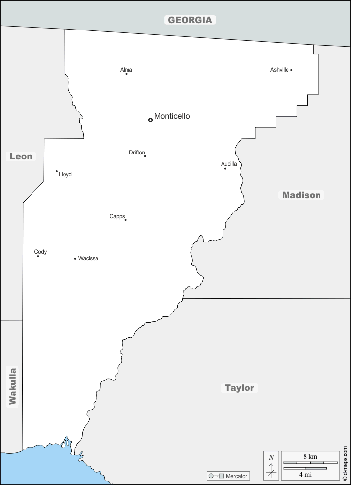 d-maps > संयुक्त राज्य > फ्लोरिडा > जेफरसन काउंटी > सीमाओं, मुख्य शहरों, नाम