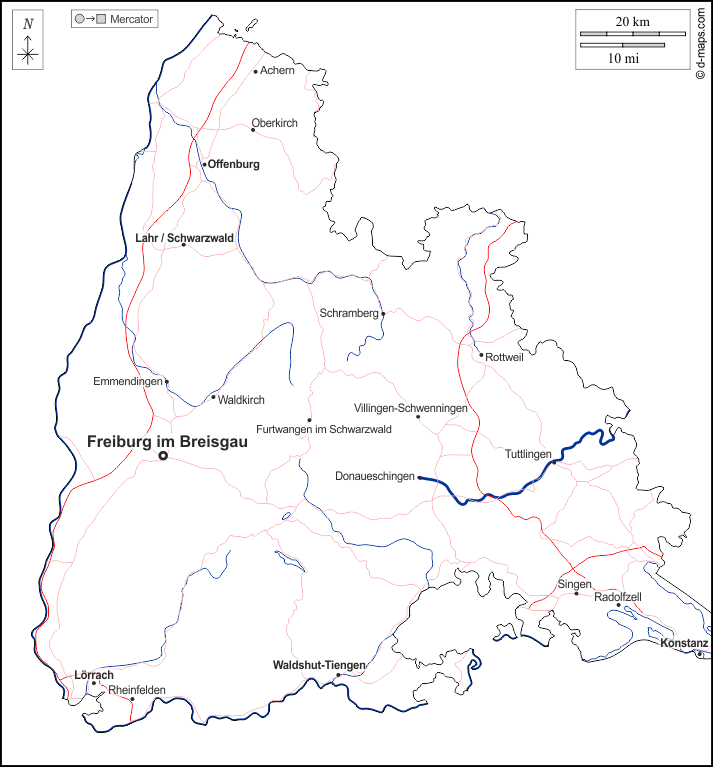 d-maps > यूरोप > जर्मनी > फ्रीबर्ग प्रशासनिक जिला > बाह्यरेखा, जल-सर्वेक्षण, मुख्य शहरों, सड़कों, नाम, सफेद