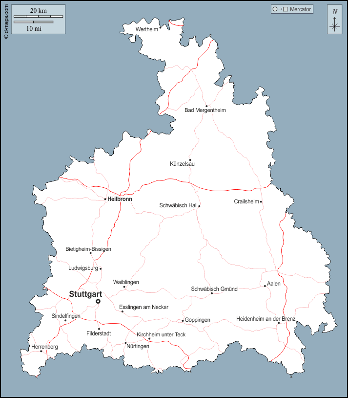 d-maps > यूरोप > जर्मनी > स्टटगार्ट प्रशासनिक जिला > बाह्यरेखा, मुख्य शहरों, सड़कों, नाम
