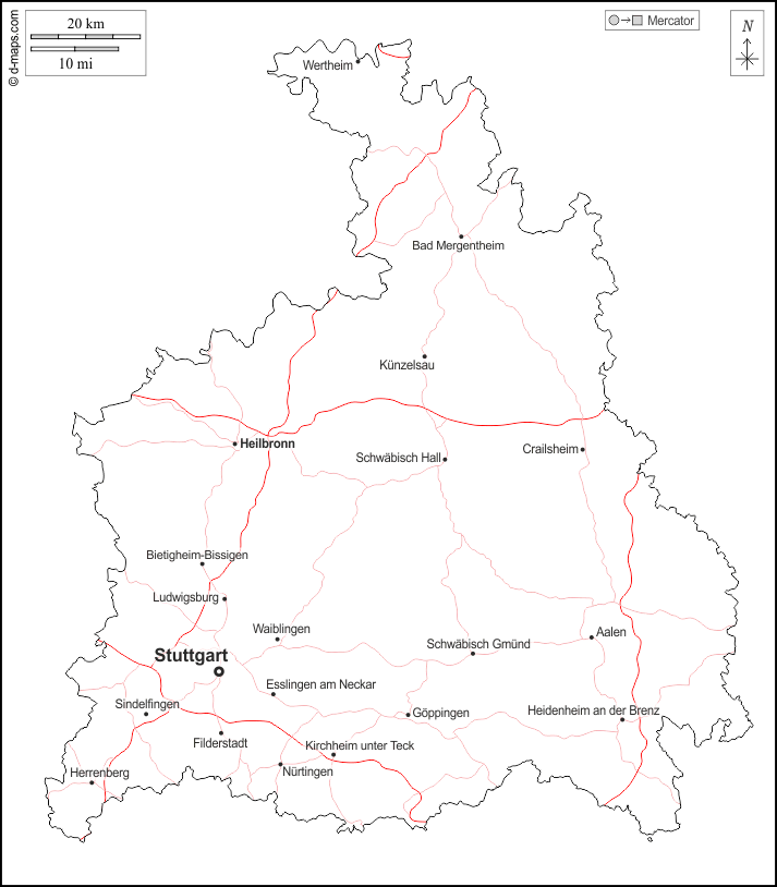 d-maps > यूरोप > जर्मनी > स्टटगार्ट प्रशासनिक जिला > बाह्यरेखा, मुख्य शहरों, सड़कों, नाम, सफेद