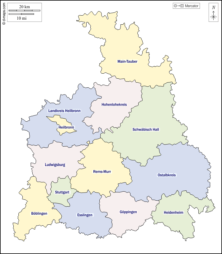 d-maps > यूरोप > जर्मनी > स्टटगार्ट प्रशासनिक जिला > बाह्यरेखा, जिलों, नाम, रंग, सफेद
