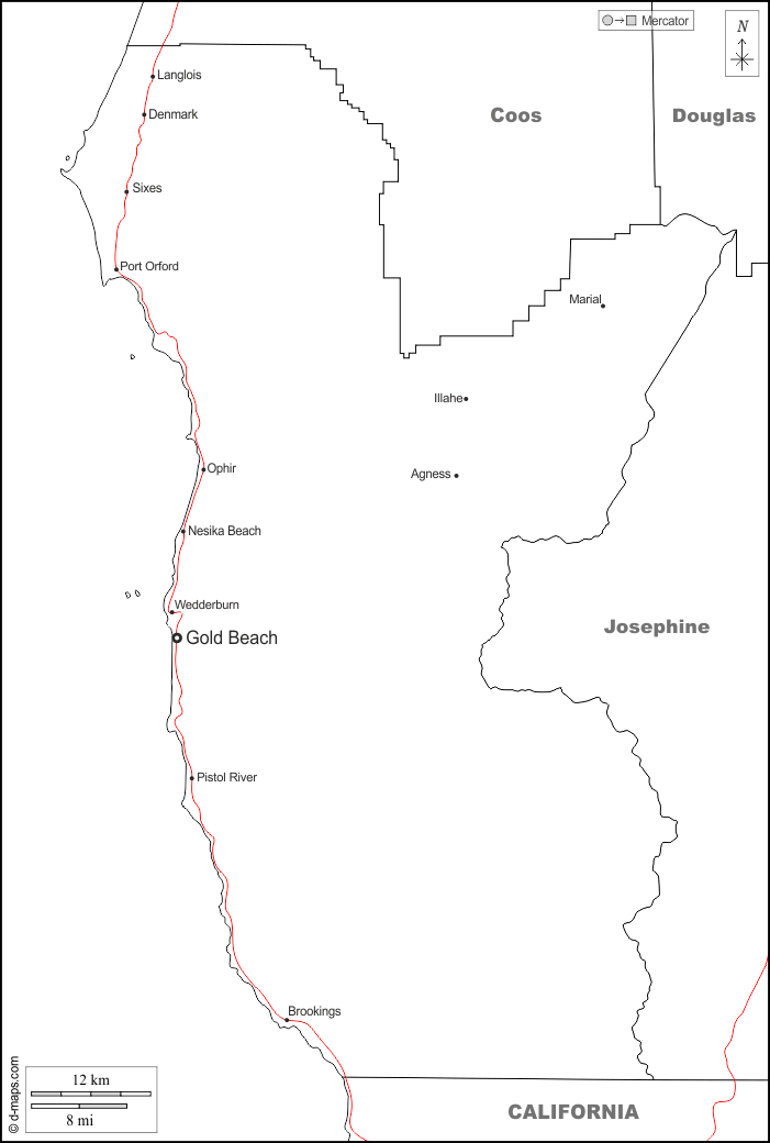d-maps > संयुक्त राज्य > औरिगन > करी काउंटी > सीमाओं, मुख्य शहरों, सड़कों, नाम, सफेद