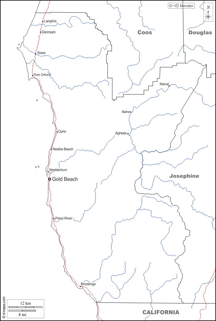 d-maps > संयुक्त राज्य > औरिगन > करी काउंटी > सीमाओं, जल-सर्वेक्षण, मुख्य शहरों, सड़कों, नाम, सफेद
