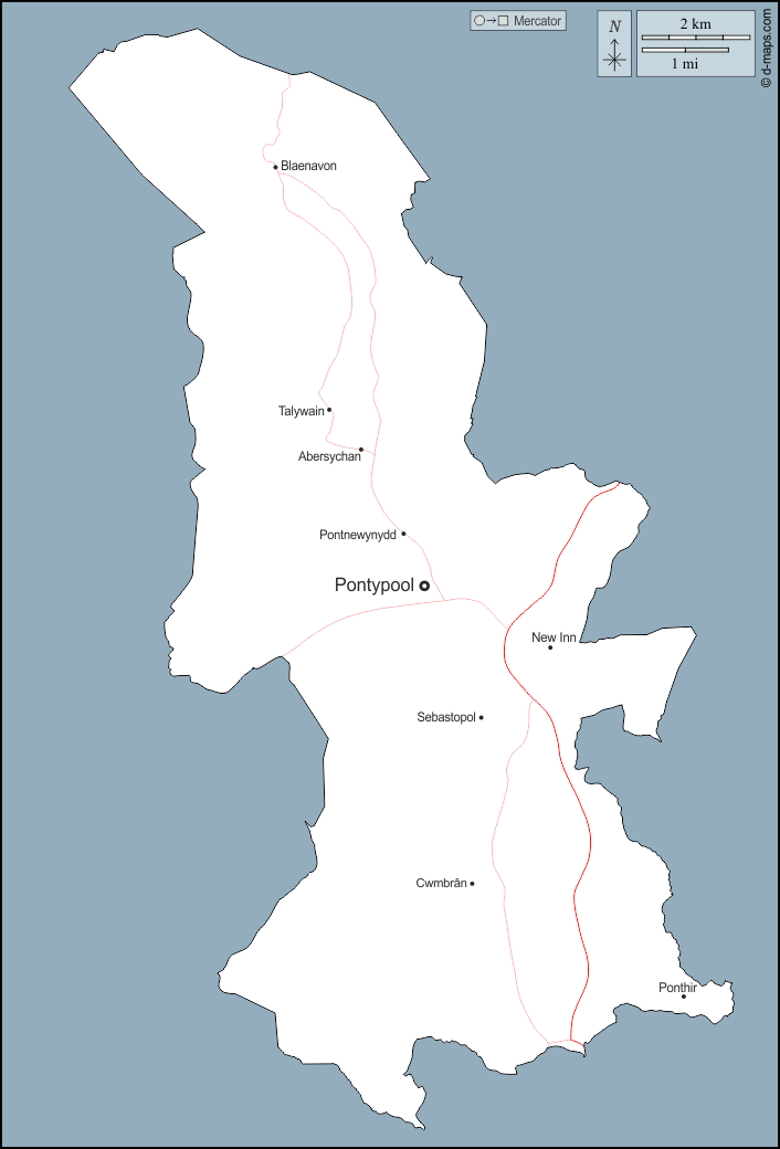 d-maps > यूरोप > युनाइटेड किंगडम > साउथ वेल्स > बाह्यरेखा, मुख्य शहरों, सड़कों, नाम