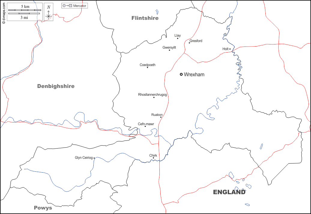 d-maps > यूरोप > युनाइटेड किंगडम > रैक्सहम > सीमाओं, जल-सर्वेक्षण, मुख्य शहरों, सड़कों, नाम, सफेद