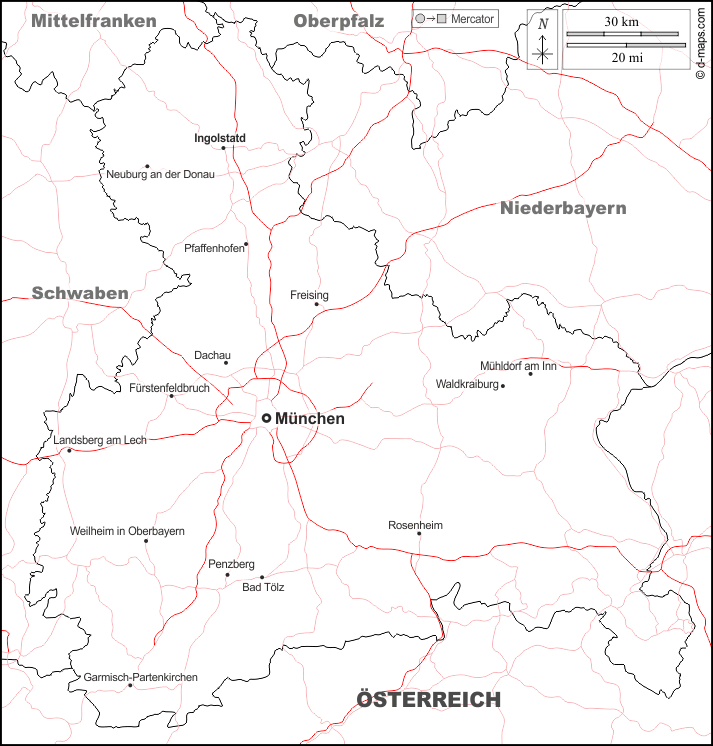 d-maps > यूरोप > जर्मनी > ऊपरी बवेरिया जिला > सीमाओं, मुख्य शहरों, सड़कों, नाम, सफेद