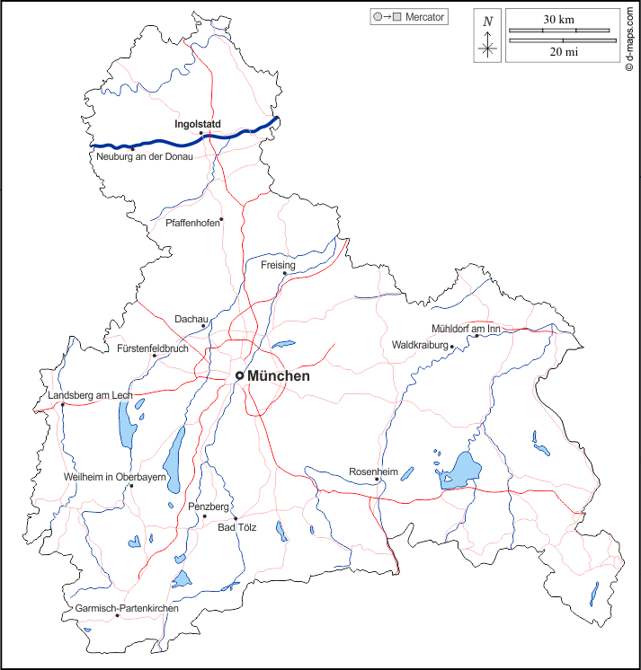 d-maps > यूरोप > जर्मनी > ऊपरी बवेरिया जिला > बाह्यरेखा, जल-सर्वेक्षण, मुख्य शहरों, सड़कों, नाम, सफेद