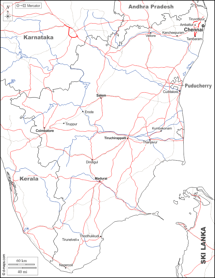 d-maps > एशिया > भारत > तमिलनाडू > सीमाओं, जल-सर्वेक्षण, मुख्य शहरों, सड़कों, नाम, सफेद