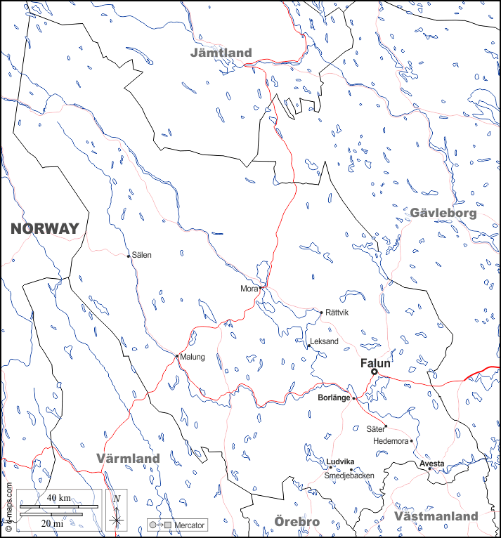 d-maps > यूरोप > स्वीडन > डलारना > सीमाओं, जल-सर्वेक्षण, मुख्य शहरों, सड़कों, नाम, सफेद