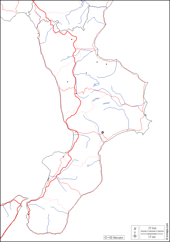 d-maps > यूरोप > इटली > कालाब्रिया > सीमाओं, जल-सर्वेक्षण, मुख्य शहरों, सड़कों, सफेद