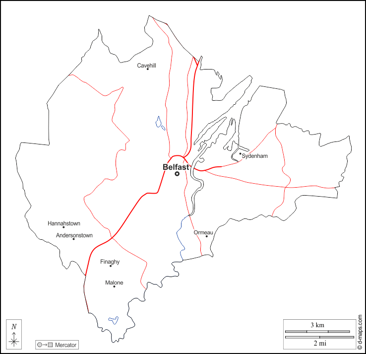d-maps > यूरोप > युनाइटेड किंगडम > बेलफास्ट > बाह्यरेखा, जल-सर्वेक्षण, मुख्य शहरों, सड़कों, नाम, सफेद