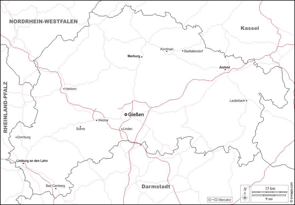 d-maps > यूरोप > जर्मनी > गिसेन प्रशासनिक जिला > सीमाओं, मुख्य शहरों, सड़कों, नाम, सफेद