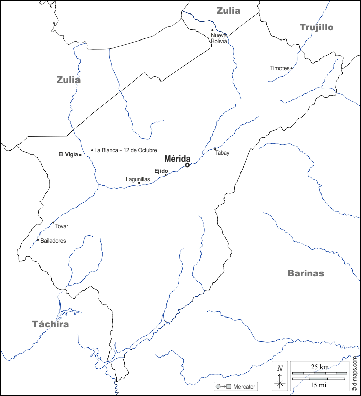 d-maps > महाअमेरिका > वेनेज़ुएला > मेरिडा > सीमाओं, जल-सर्वेक्षण, मुख्य शहरों, नाम, सफेद