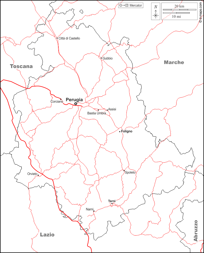 d-maps > यूरोप > इटली > उम्ब्रिया > सीमाओं, मुख्य शहरों, सड़कों, नाम, सफेद