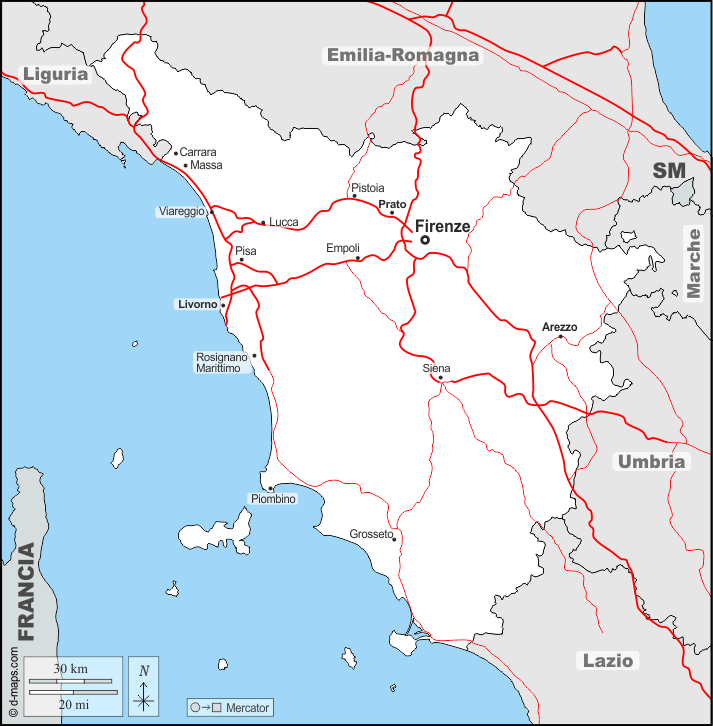 d-maps > यूरोप > इटली > टस्कनी > सीमाओं, मुख्य शहरों, सड़कों, नाम