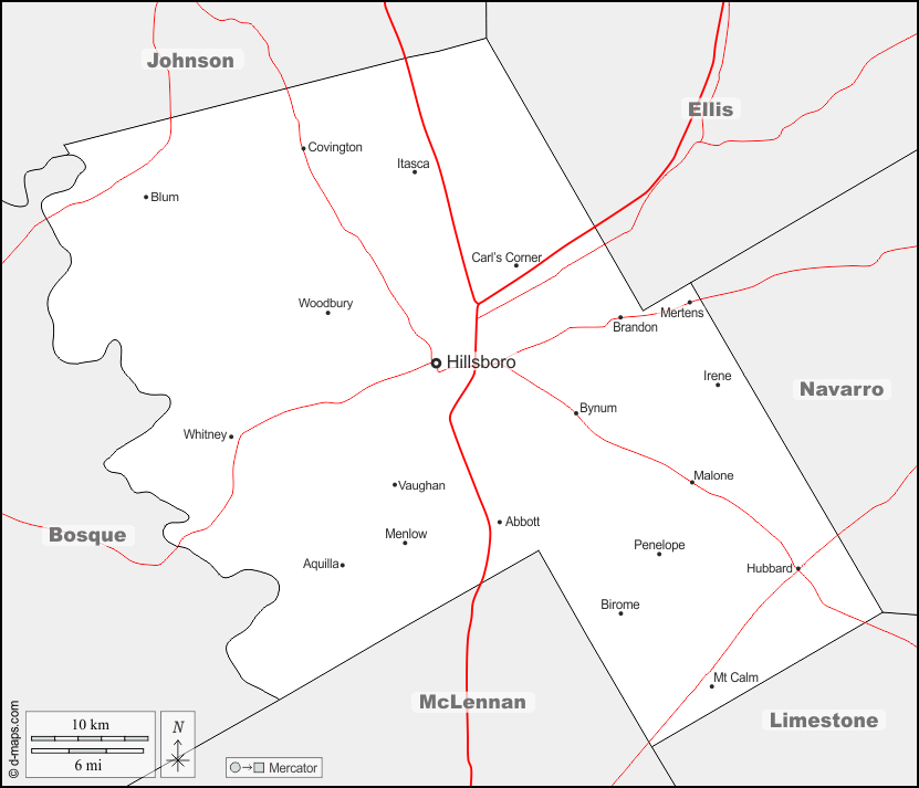 d-maps > संयुक्त राज्य > टेक्सास > हिल काउंटी > सीमाओं, मुख्य शहरों, सड़कों, नाम