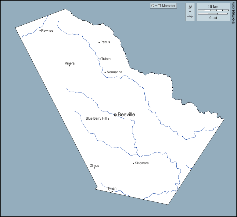 d-maps > संयुक्त राज्य > टेक्सास > बी काउंटी > बाह्यरेखा, जल-सर्वेक्षण, मुख्य शहरों, नाम