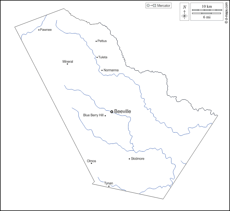 d-maps > संयुक्त राज्य > टेक्सास > बी काउंटी > बाह्यरेखा, जल-सर्वेक्षण, मुख्य शहरों, नाम, सफेद