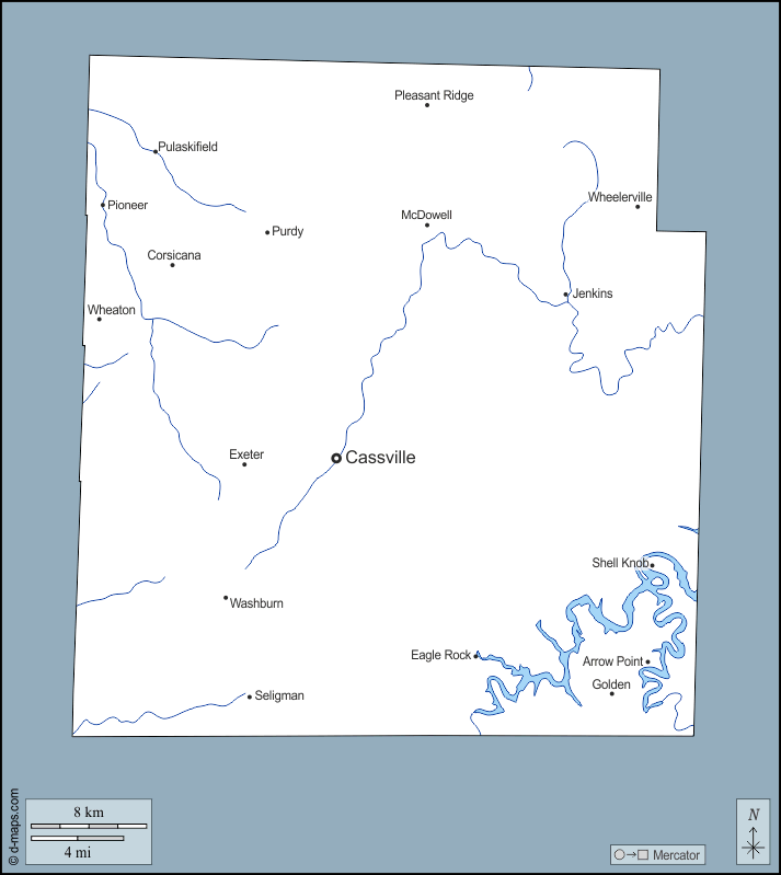 d-maps > संयुक्त राज्य > मिज़ूरी > बैरी काउंटी > बाह्यरेखा, जल-सर्वेक्षण, मुख्य शहरों, नाम