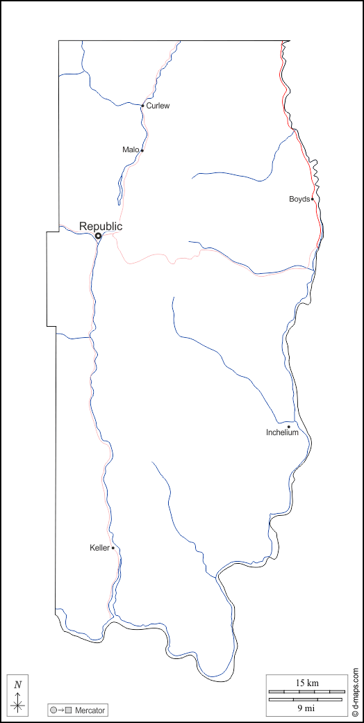d-maps > संयुक्त राज्य > वॉशिंगटन > फेरी काउंटी > बाह्यरेखा, जल-सर्वेक्षण, मुख्य शहरों, सड़कों, नाम, सफेद
