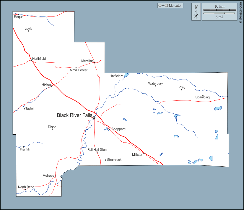 d-maps > संयुक्त राज्य > विस्कॉंसिन > जैक्सन काउंटी > बाह्यरेखा, जल-सर्वेक्षण, मुख्य शहरों, सड़कों, नाम