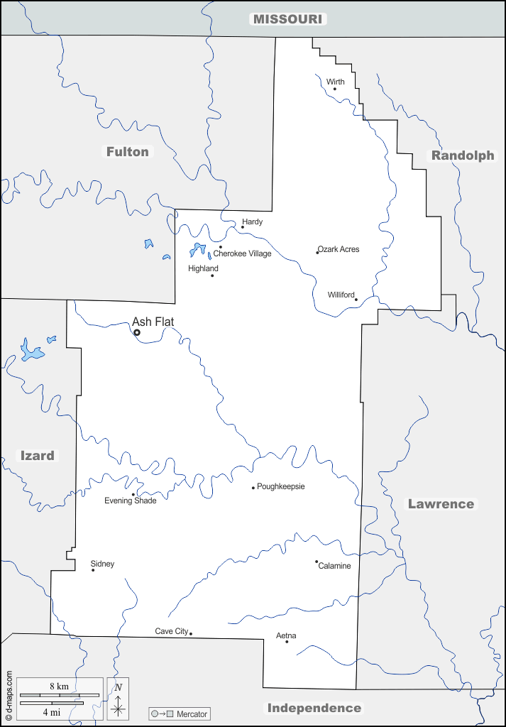 d-maps > संयुक्त राज्य > आर्कन्सा > शार्प काउंटी > सीमाओं, जल-सर्वेक्षण, मुख्य शहरों, नाम