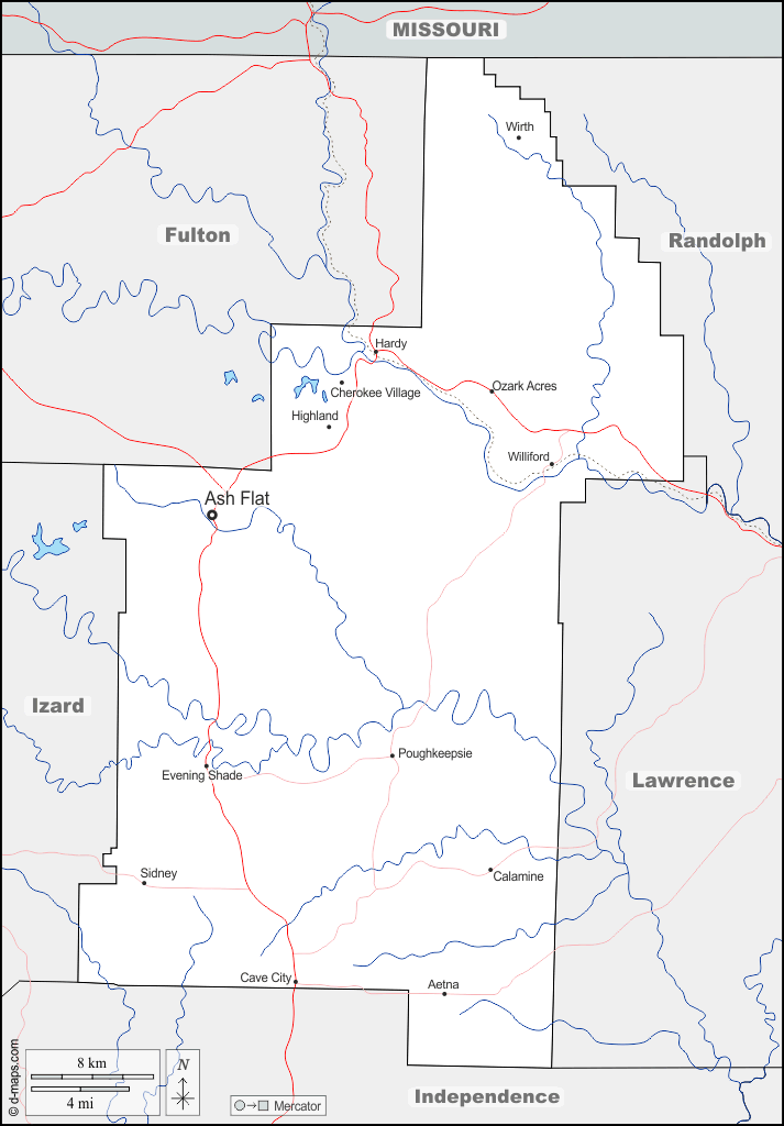 d-maps > संयुक्त राज्य > आर्कन्सा > शार्प काउंटी > सीमाओं, जल-सर्वेक्षण, मुख्य शहरों, सड़कों, नाम