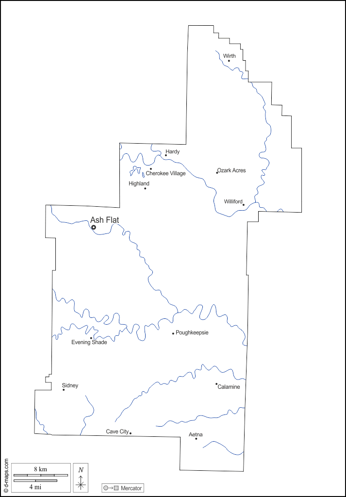 d-maps > संयुक्त राज्य > आर्कन्सा > शार्प काउंटी > बाह्यरेखा, जल-सर्वेक्षण, मुख्य शहरों, नाम, सफेद