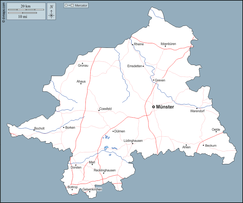 d-maps > यूरोप > जर्मनी > मुंस्टर प्रशासनिक जिला > बाह्यरेखा, जल-सर्वेक्षण, मुख्य शहरों, सड़कों, नाम