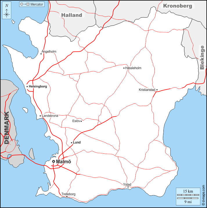 d-maps > यूरोप > स्वीडन > स्कैनिया > सीमाओं, मुख्य शहरों, सड़कों, नाम