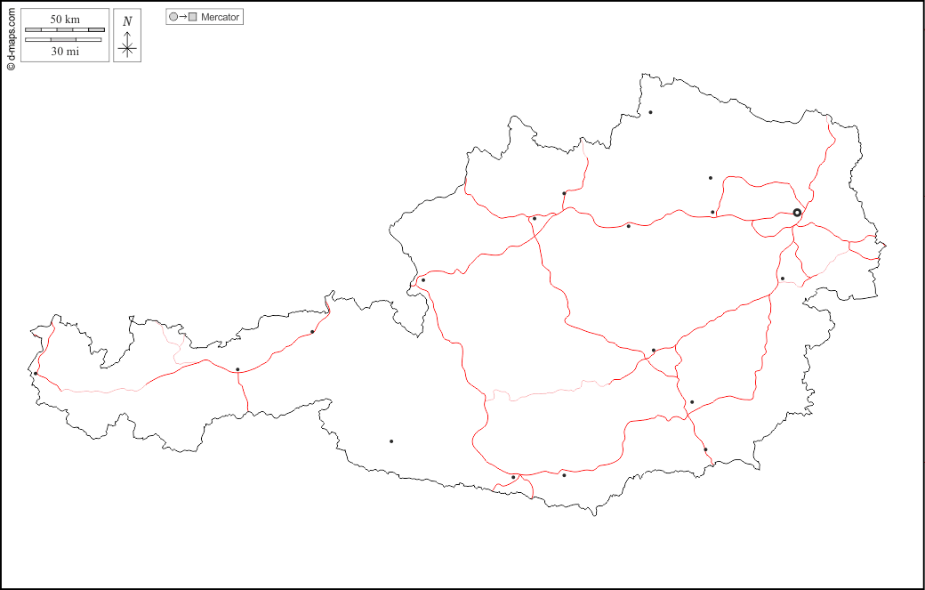d-maps > यूरोप > ऑस्ट्रिया > ऑस्ट्रिया > बाह्यरेखा, मुख्य शहरों, सड़कों, सफेद