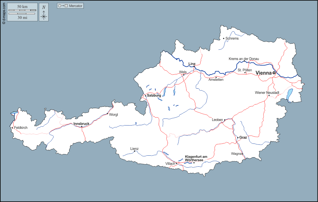 d-maps > यूरोप > ऑस्ट्रिया > ऑस्ट्रिया > बाह्यरेखा, जल-सर्वेक्षण, मुख्य शहरों, सड़कों, नाम