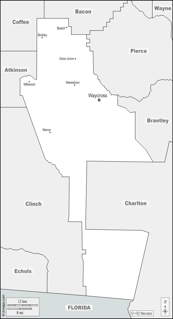d-maps > संयुक्त राज्य > जॉर्जिया > वेयर काउंटी > सीमाओं, मुख्य शहरों, नाम