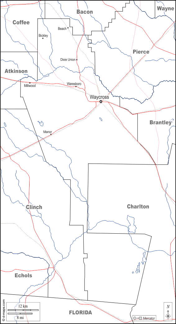 d-maps > संयुक्त राज्य > जॉर्जिया > वेयर काउंटी > सीमाओं, जल-सर्वेक्षण, मुख्य शहरों, सड़कों, नाम, सफेद
