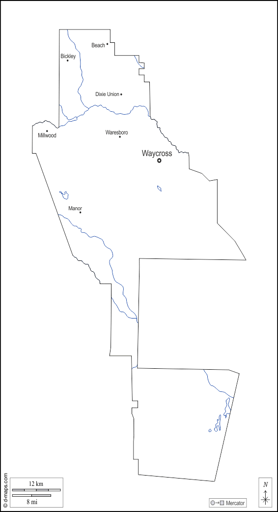 d-maps > संयुक्त राज्य > जॉर्जिया > वेयर काउंटी > बाह्यरेखा, जल-सर्वेक्षण, मुख्य शहरों, नाम, सफेद