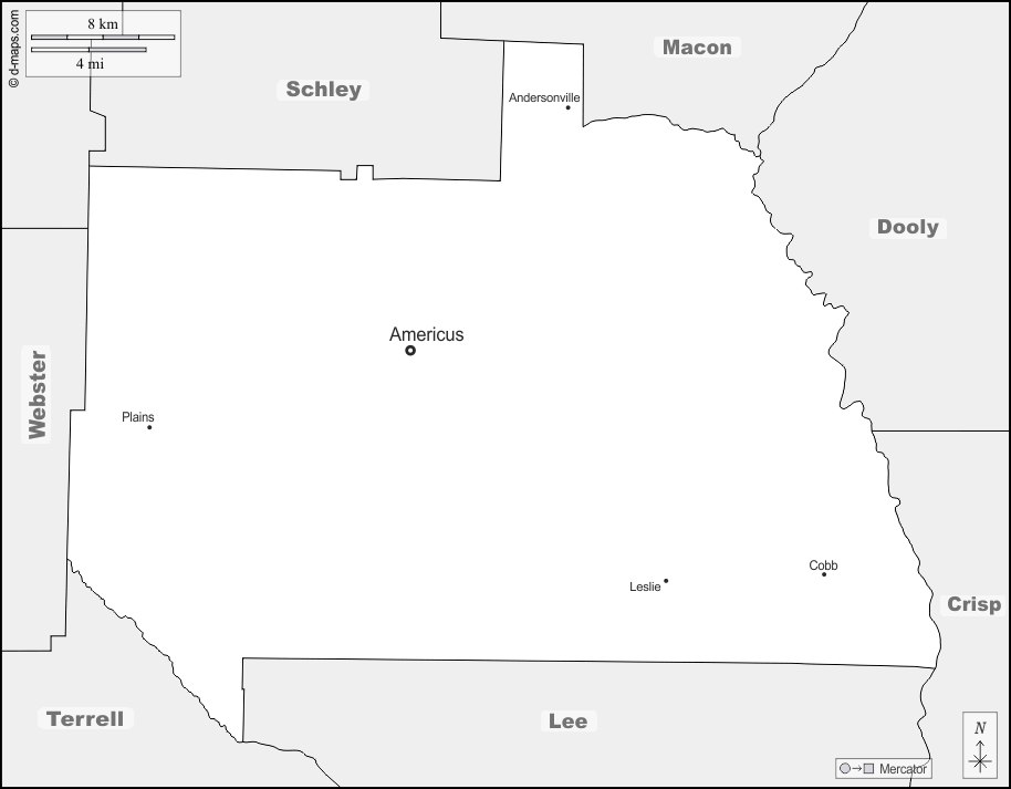 d-maps > संयुक्त राज्य > जॉर्जिया > सुम्टर काउंटी > सीमाओं, मुख्य शहरों, नाम
