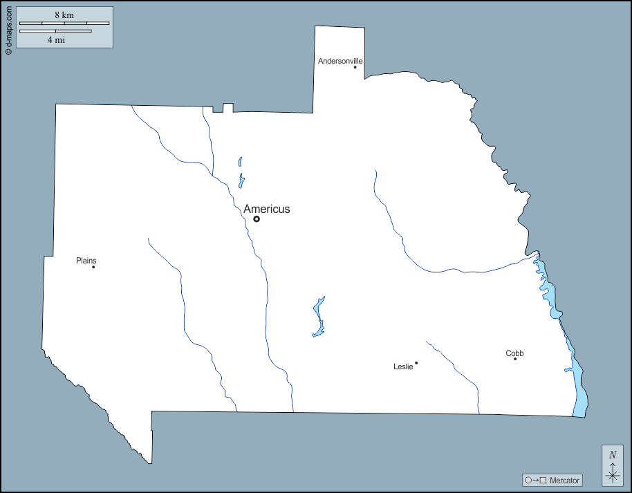 d-maps > संयुक्त राज्य > जॉर्जिया > सुम्टर काउंटी > बाह्यरेखा, जल-सर्वेक्षण, मुख्य शहरों, नाम