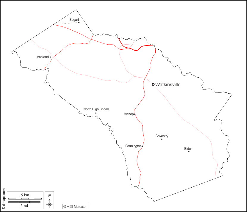 d-maps > संयुक्त राज्य > जॉर्जिया > ओकोनी काउंटी > बाह्यरेखा, मुख्य शहरों, सड़कों, नाम, सफेद