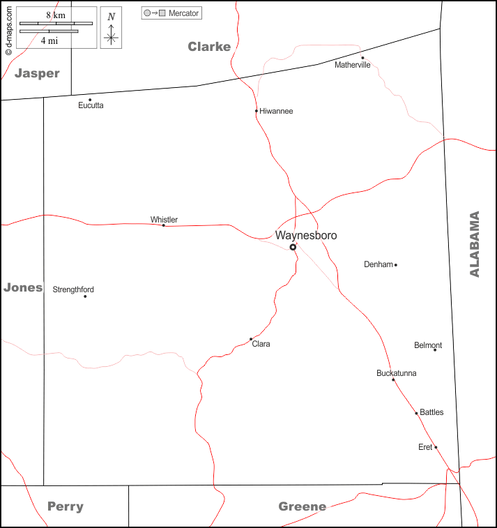 d-maps > संयुक्त राज्य > मिसिसिपी > वेन काउंटी > सीमाओं, मुख्य शहरों, सड़कों, नाम, सफेद