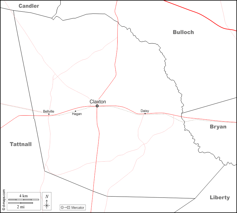 d-maps > संयुक्त राज्य > जॉर्जिया > इवांस काउंटी > सीमाओं, मुख्य शहरों, सड़कों, नाम, सफेद
