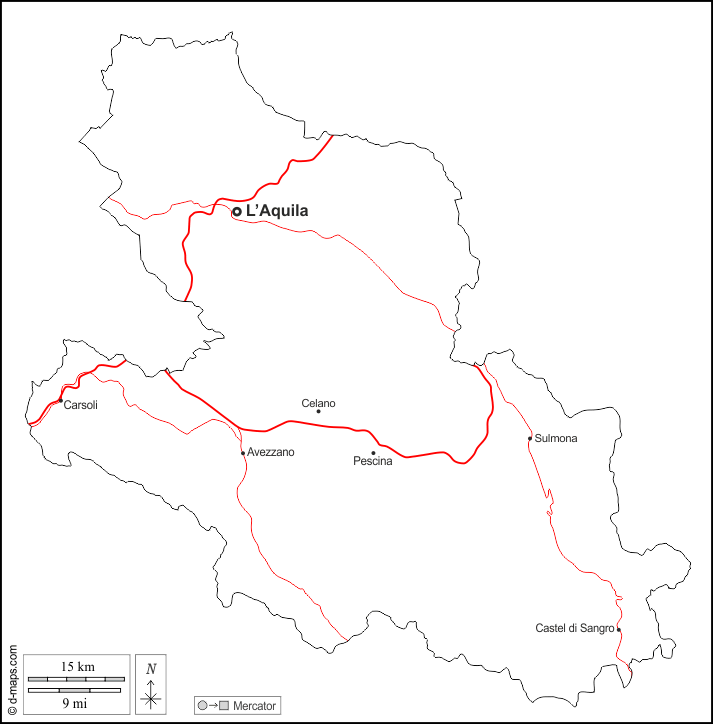 d-maps > यूरोप > इटली > ल अक्विला > बाह्यरेखा, मुख्य शहरों, सड़कों, नाम, सफेद