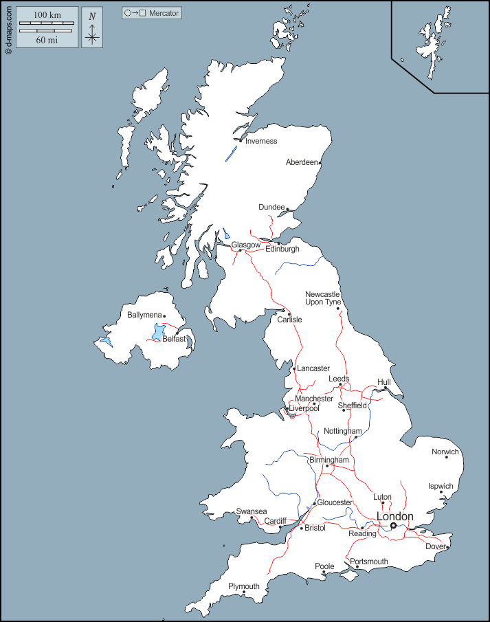 d-maps > यूरोप > युनाइटेड किंगडम > युनाइटेड किंगडम > बाह्यरेखा, जल-सर्वेक्षण, मुख्य शहरों, सड़कों, नाम
