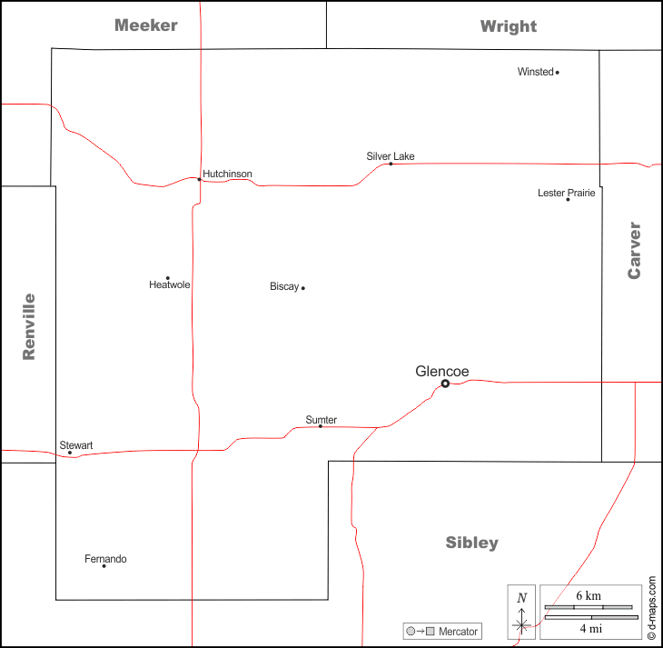 d-maps > संयुक्त राज्य > मिनेसोटा > मैकलियोड काउंटी > सीमाओं, मुख्य शहरों, सड़कों, नाम, सफेद