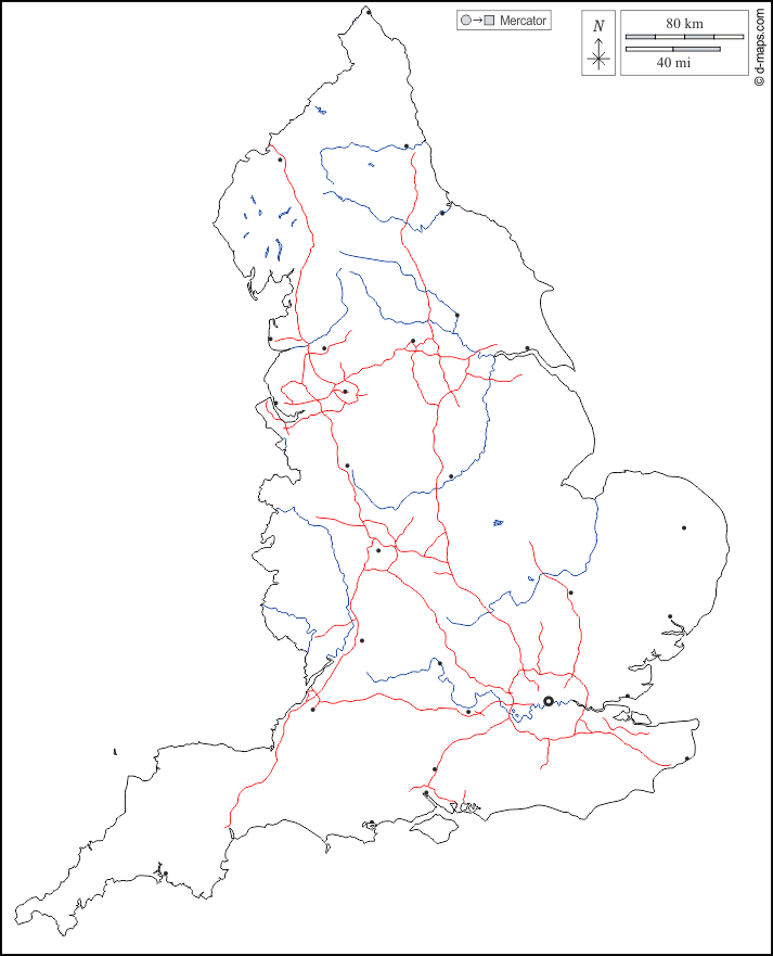 d-maps > यूरोप > युनाइटेड किंगडम > इंग्लैंड > बाह्यरेखा, जल-सर्वेक्षण, मुख्य शहरों, सड़कों, सफेद
