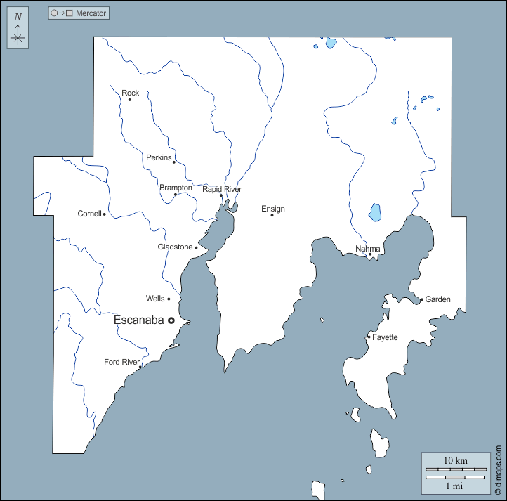 d-maps > संयुक्त राज्य > मिशिगन > डेल्टा काउंटी > बाह्यरेखा, जल-सर्वेक्षण, मुख्य शहरों, नाम