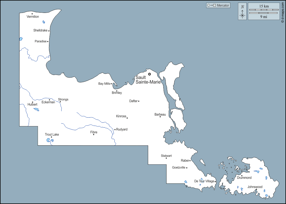d-maps > संयुक्त राज्य > मिशिगन > चिप्पवे काउंटी > बाह्यरेखा, जल-सर्वेक्षण, मुख्य शहरों, नाम