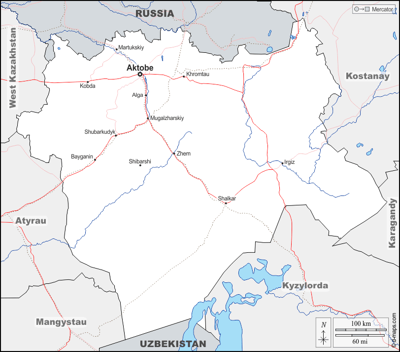 d-maps > एशिया > कज़ाकस्तान > अक्तोबे > सीमाओं, जल-सर्वेक्षण, मुख्य शहरों, सड़कों, नाम