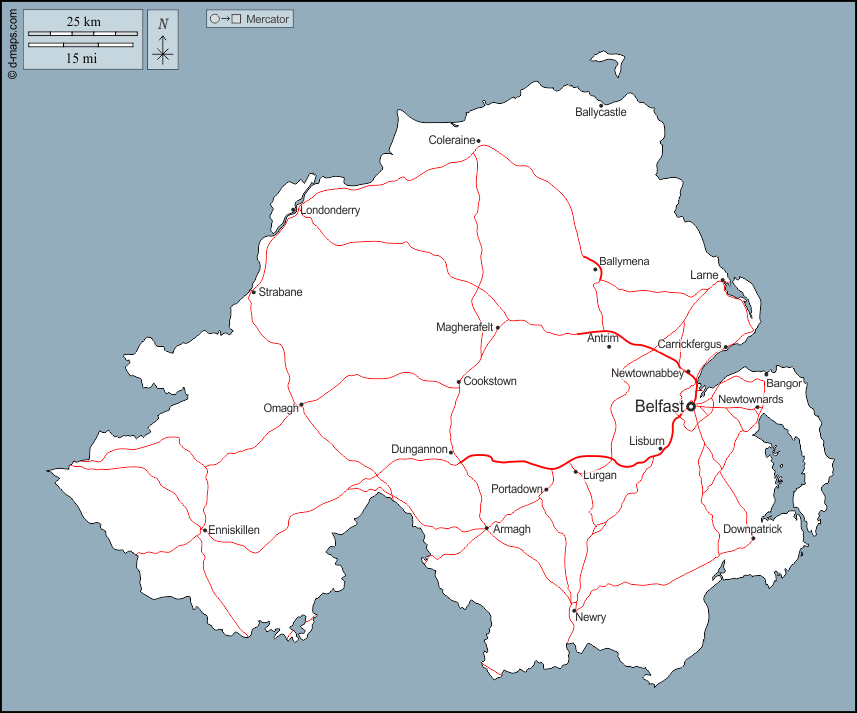 d-maps > यूरोप > युनाइटेड किंगडम > उत्तरी आयरलैंड > बाह्यरेखा, मुख्य शहरों, सड़कों, नाम