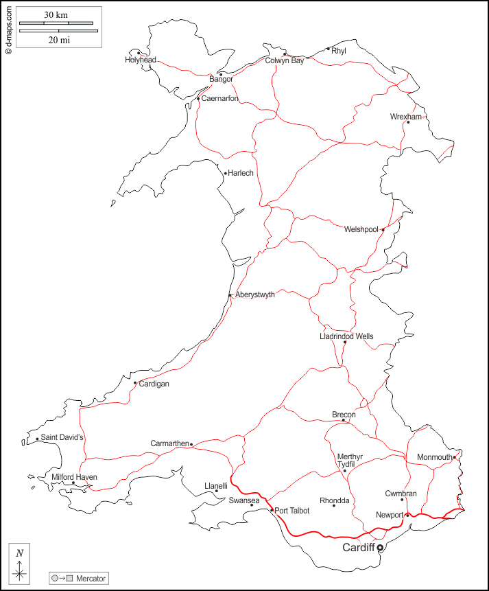 d-maps > यूरोप > युनाइटेड किंगडम > वेल्स > बाह्यरेखा, मुख्य शहरों, सड़कों, नाम, सफेद
